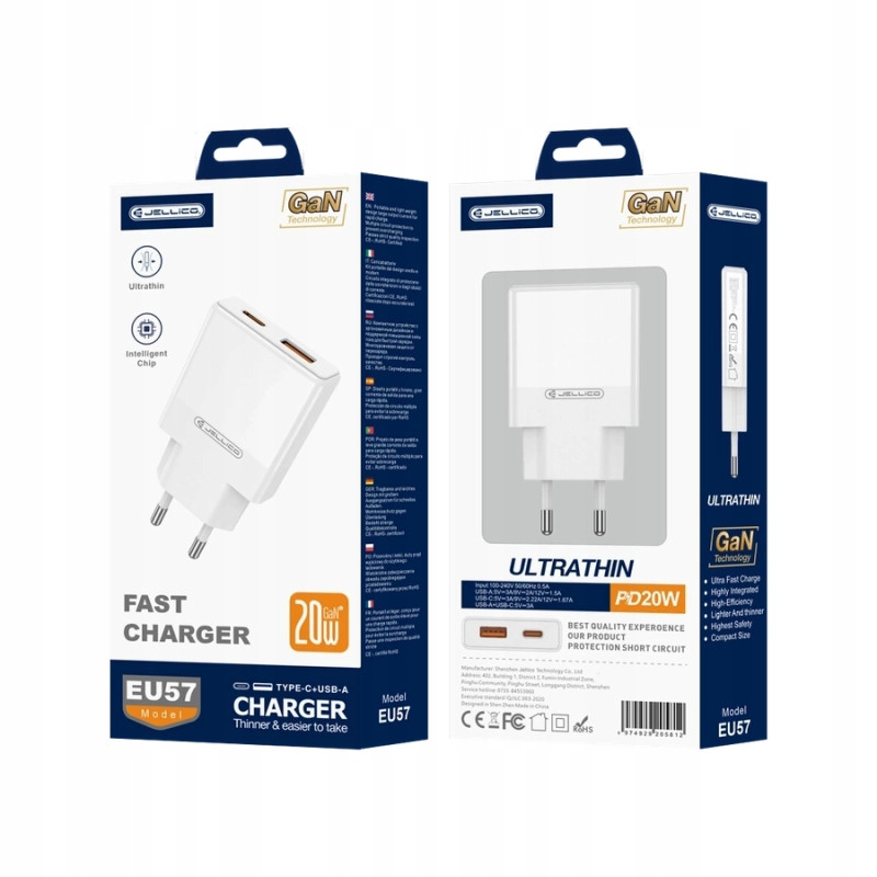 JELLICO EU57 PD 20W to kompaktowa i wydajna ładowarka sieciowa wyposażona w dwa porty: USB-C z technologią Power Delivery oraz USB-A z Quick Charge 3.0. Umożliwia szybkie ładowanie większości nowoczesnych urządzeń – od smartfonów po tablety. Obsługuje napięcia do 12V, oferując prąd nawet do 3000 mA. Dzięki mocy 20W idealnie sprawdzi się zarówno w domu, jak i w podróży. Nowoczesny, biały design i uniwersalna kompatybilność sprawiają, że to niezastąpiony dodatek do codziennego ładowania.