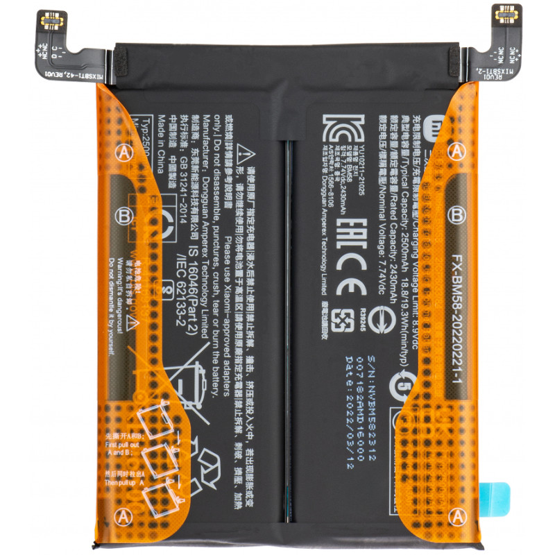 Bateria Xiaomi BM58 jest baterią dwukomórkową. Oznacza to, że wewnątrz znajdują się dwa niezależne ogniwa, z których każde ma pojemność 2500 mAh.